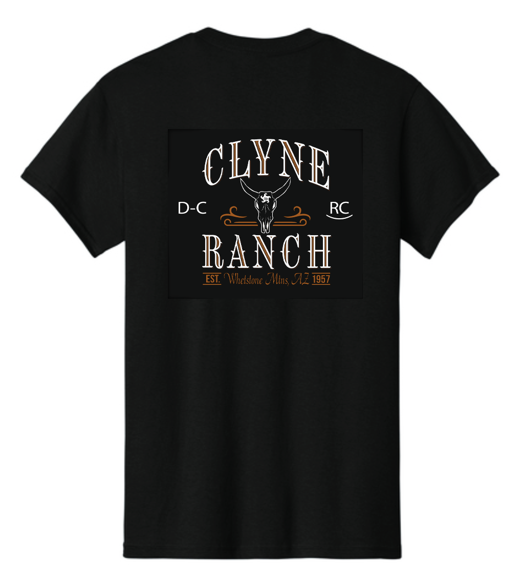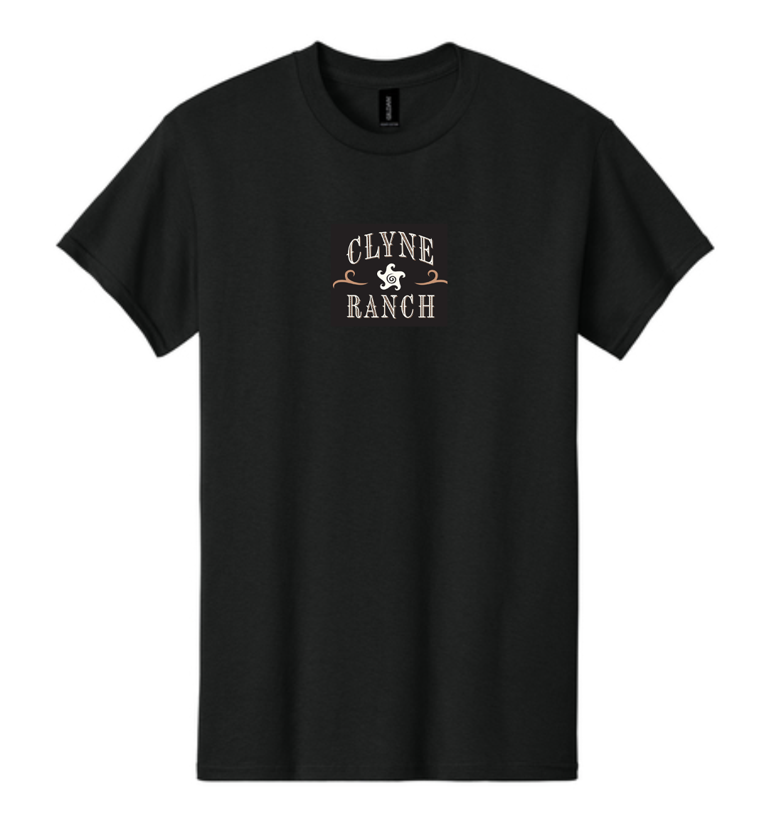 Black 100% cotton t-shirt with large Clyne Ranch logo on back, small logo on front in the center, available in M, L, XL, 2X.