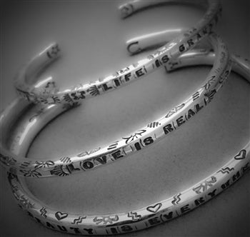 Handcrafted by Tempe, Arizona artist Hoss Rogers, a set of three bracelets stamped with "Life is Grand," "Love is Real" and "Beauty is Everywhere" (one saying on each bracelet). Made of beautiful 6-guage sterling silver. Please allow an extra week of production time when ordering as Hoss creates each order by hand once the order is placed. The Men's bracelets are thicker and heavier and use more silver so they are a higher price. Thank you.
